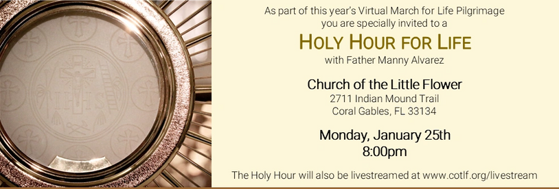 Join Father Manny Alvarez, Chaplain of the Archdiocese of Miami March for Life Pilgrimage, for a Holy Hour for Life at the Church of the Little Flower (Coral Gables), on MONDAY, JANUARY 25th at 8:00 PM EST. The Holy Hour will also be live-streamed at www.cotlf.org/livestream
